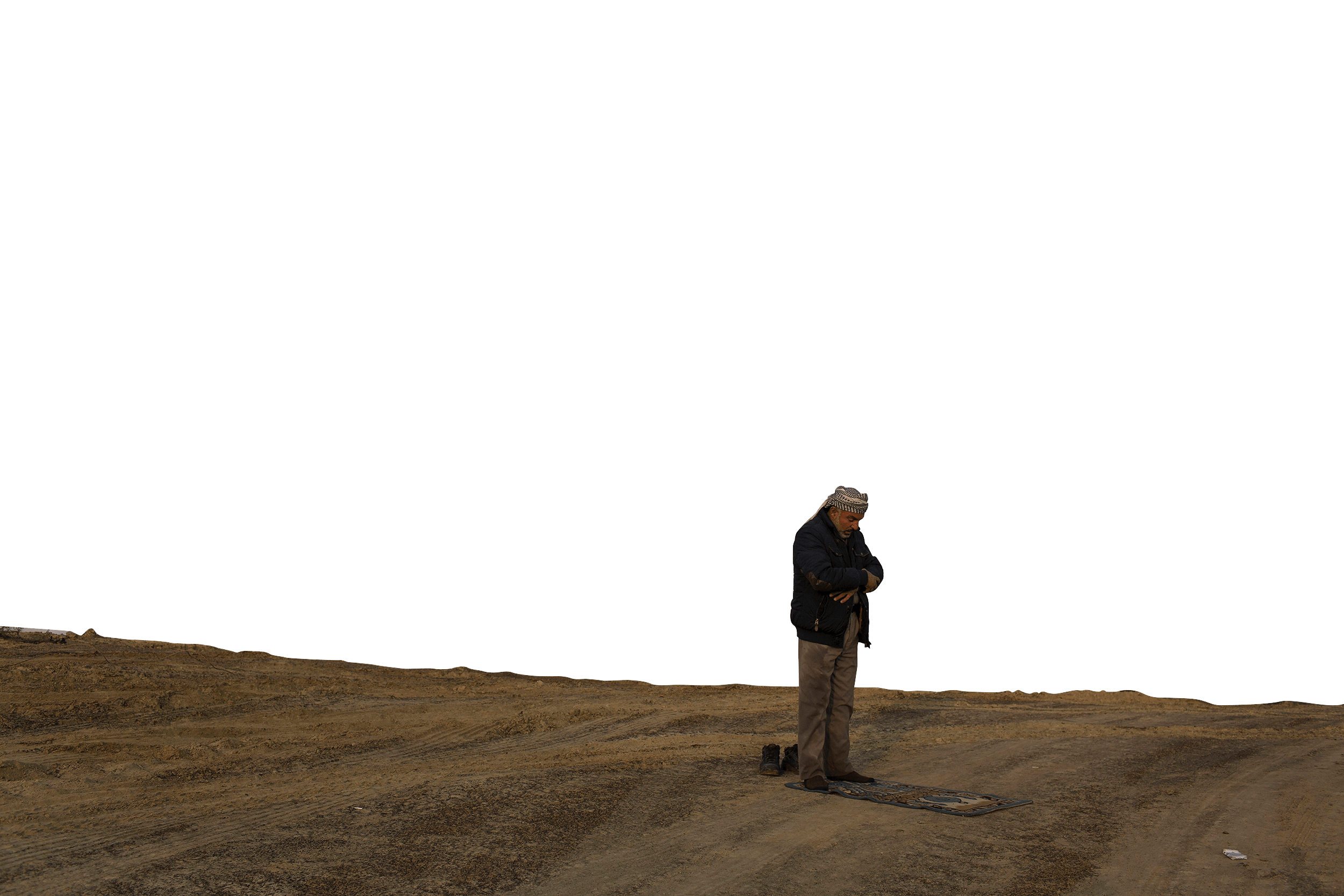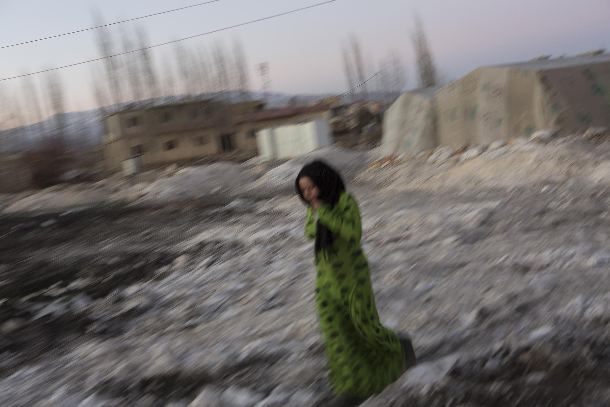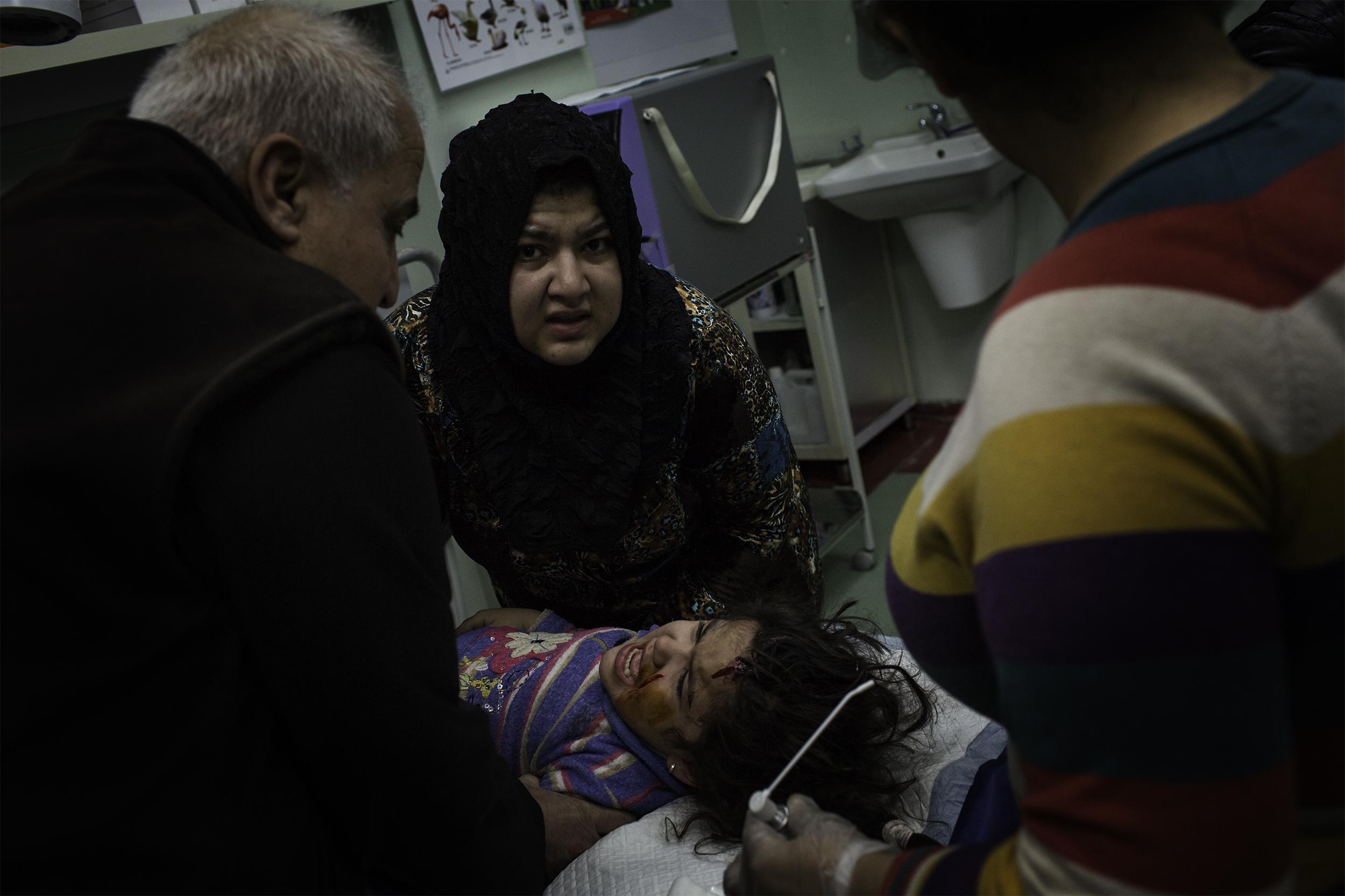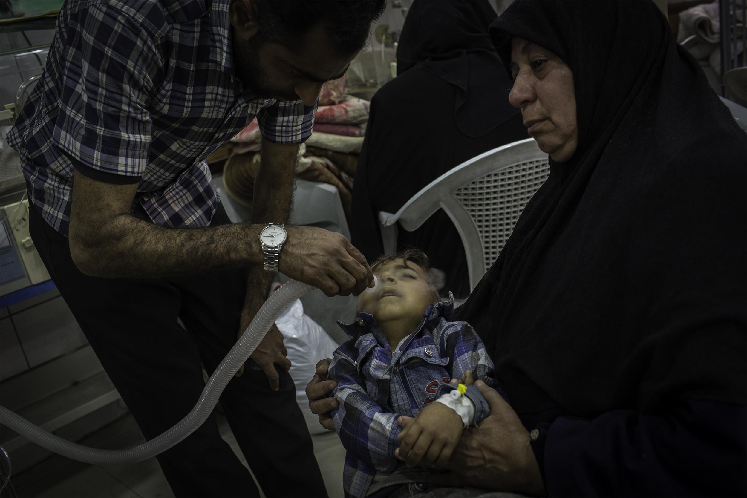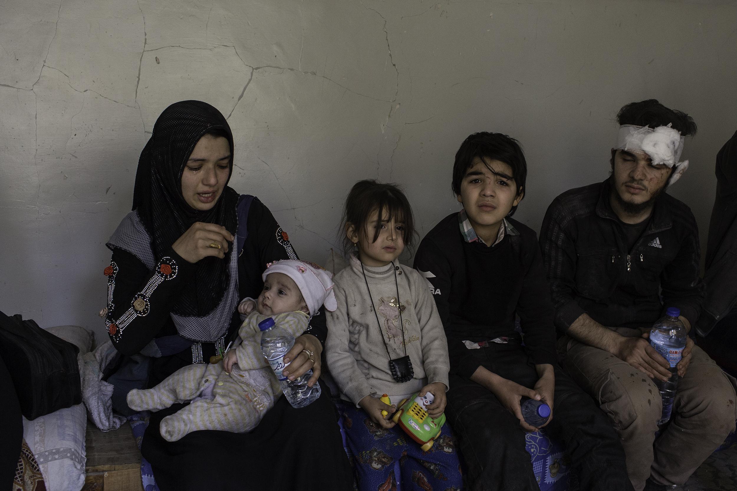 ISIS의 공포정치에서 탈출한 티그리스 출신 이라크인 모자. 무인지대를 거쳐 10km여를 걸어오는 도중 어린 아들이 지뢰를 밟았지만 속수무책으로 부상 당한 아이를 안고 계속 걸어야만 했다. 쿠르드군 참호에 도착하여 도움을 청하고 있다. 2016년 5월 하위자, 이라크