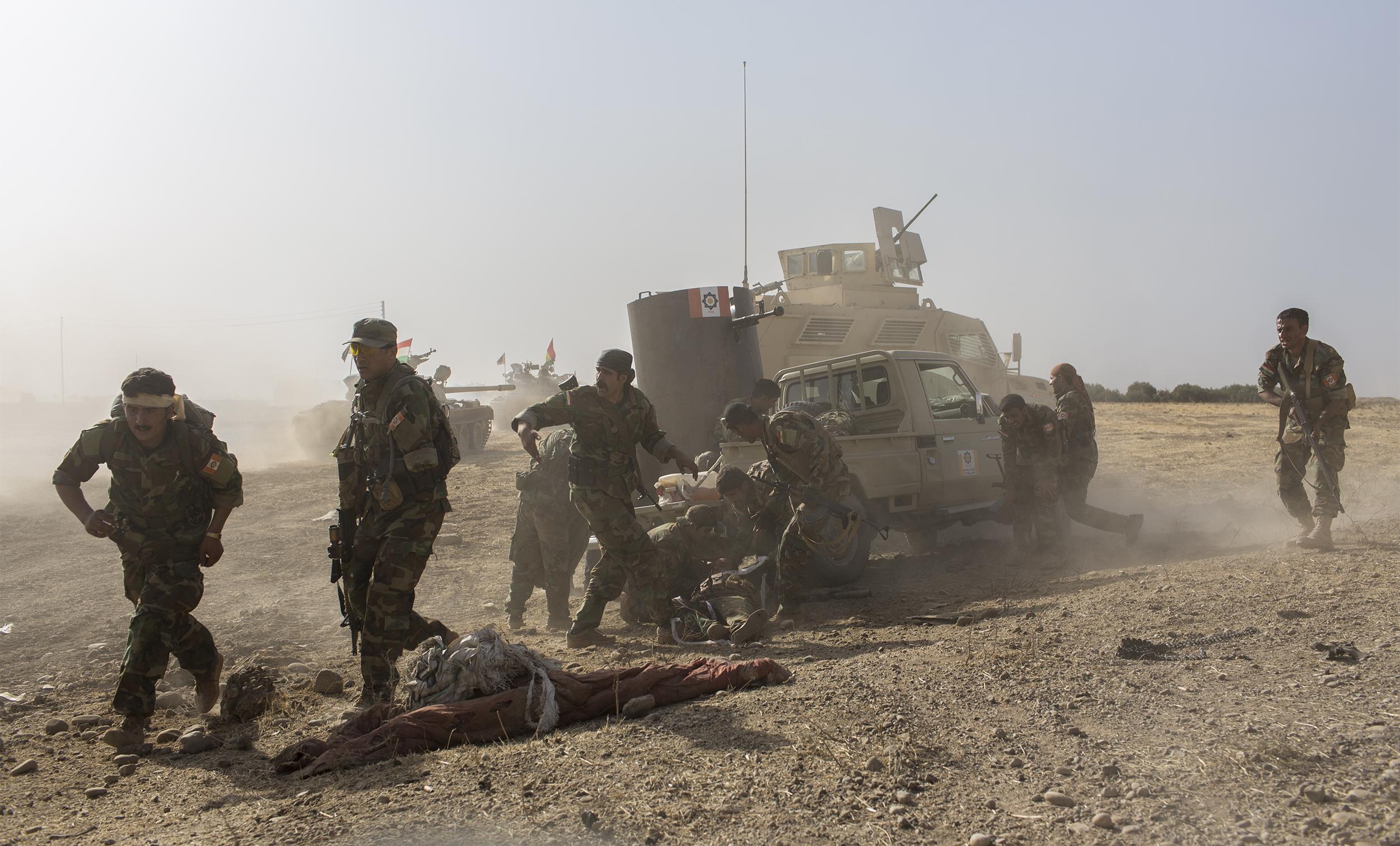 ISIS에 매복을 당한 직후 급히 후퇴하는 쿠르드 민병대. 2016년 12월 바시카, 이라크