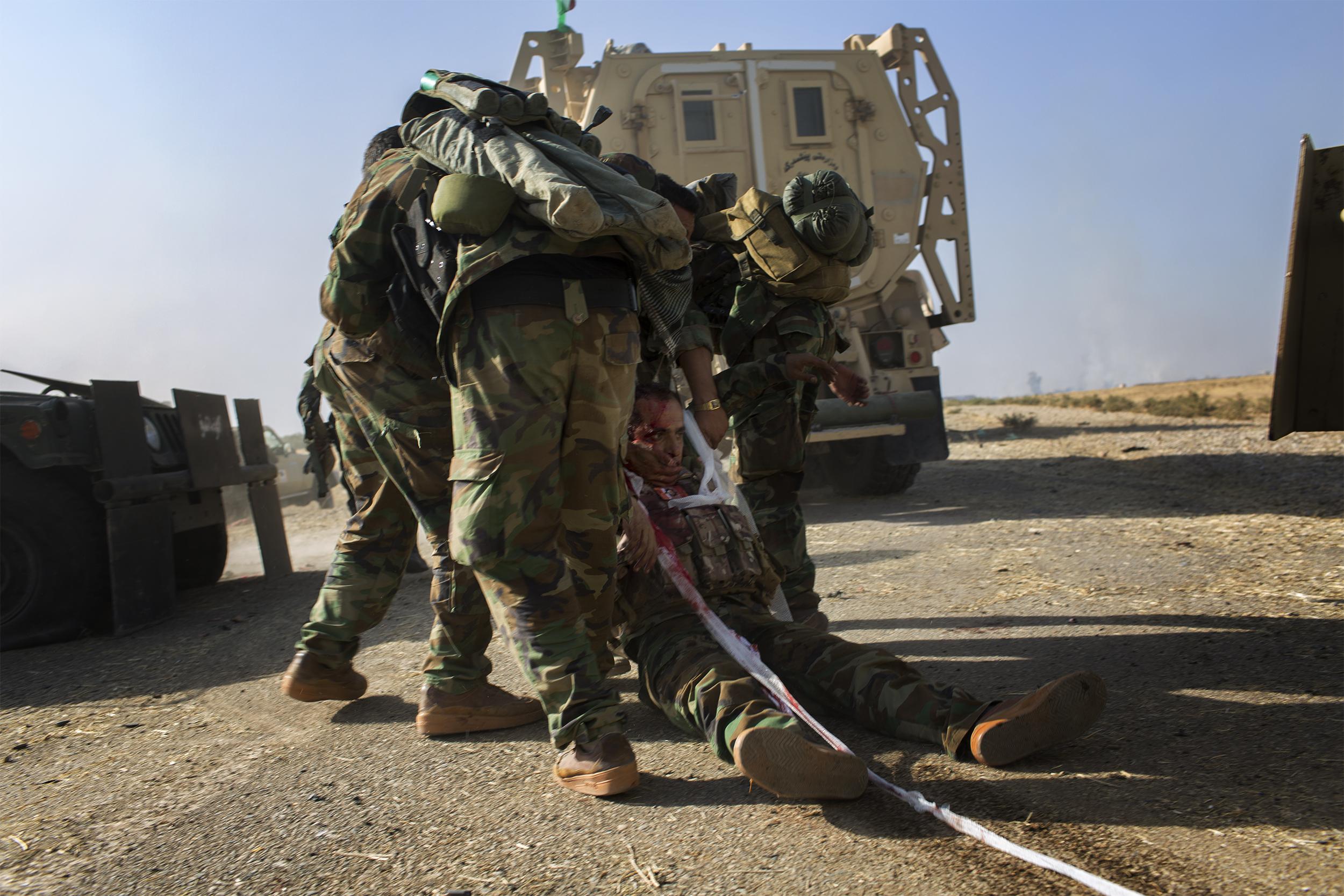 ISIS에 대항해 싸우던 쿠르드계 민병대의 젊은 군인. 갑작스런 매복의 공격을 가까스로 벗어난 후. 2016년 10월 바시카, 이라크