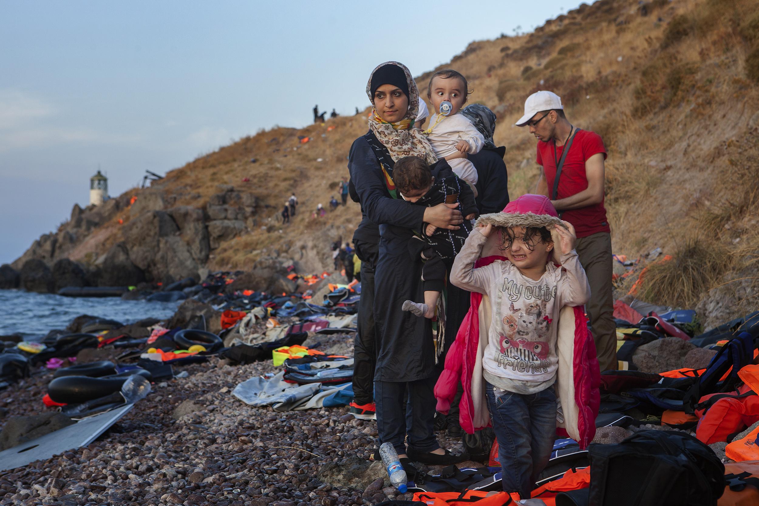 조부에서 손자까지 3대 모두 피난의 여정에 오른 아프가니스탄 가족. 비용 때문에 또는 혹시라도 발생할 수 있는 위험과 사고를 최소화하기 위해 가족 구성원의 일부만이 떠나는 경우가 많지만 간혹 대가족 전체가 그 고난을 함께 헤쳐나가는 경우도 있다. 2015년 9월 레스보스