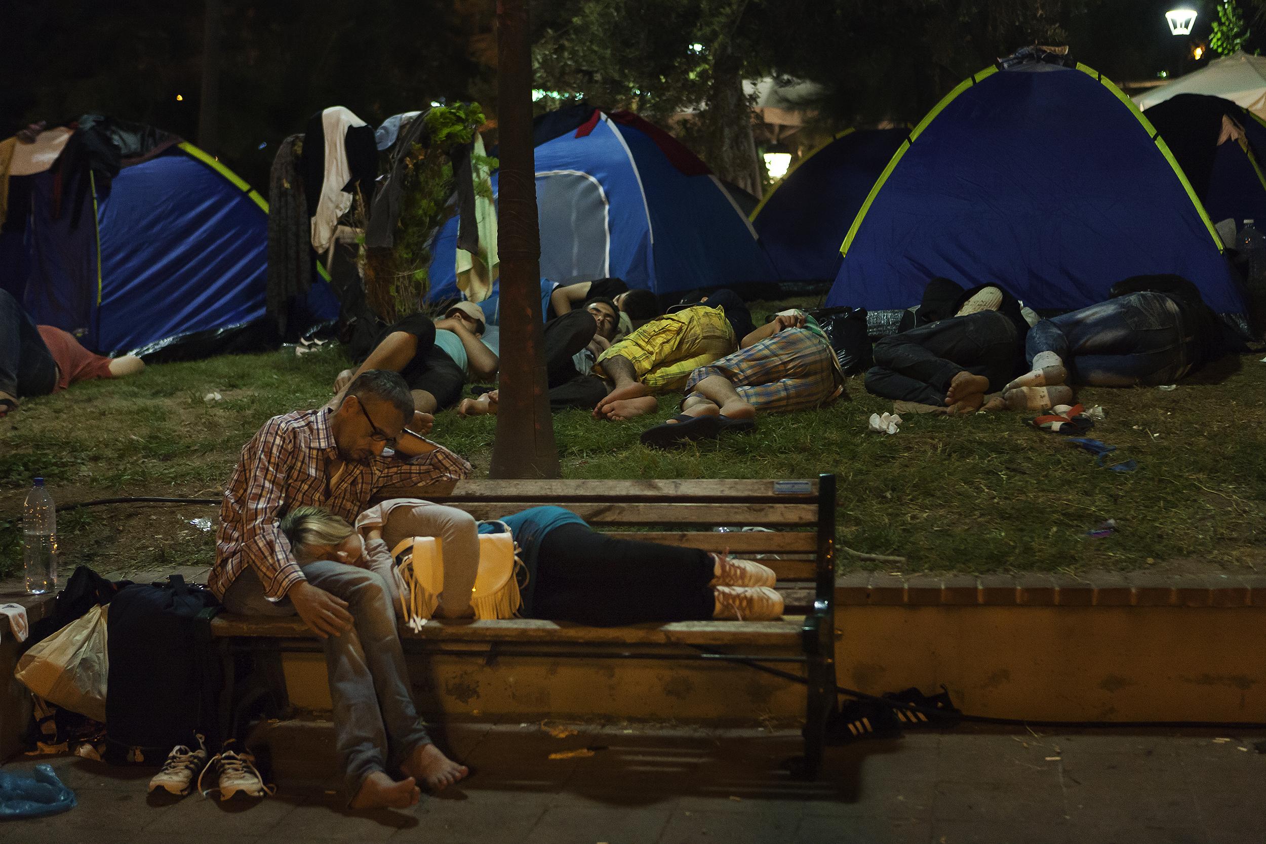 서로에게 의지해 잠을 청하고 있던 난민 커플. 넘쳐나던 난민들과 부족한 수용시설로 레스보스 섬은 도심 내 공원 등에서 텐트를 치거나 누울 자리만 있으면 어디든 허가증 발급까지 대기하는 동안의 임시 거처가 되었다. 2015년 9월 레스보스, 그리스