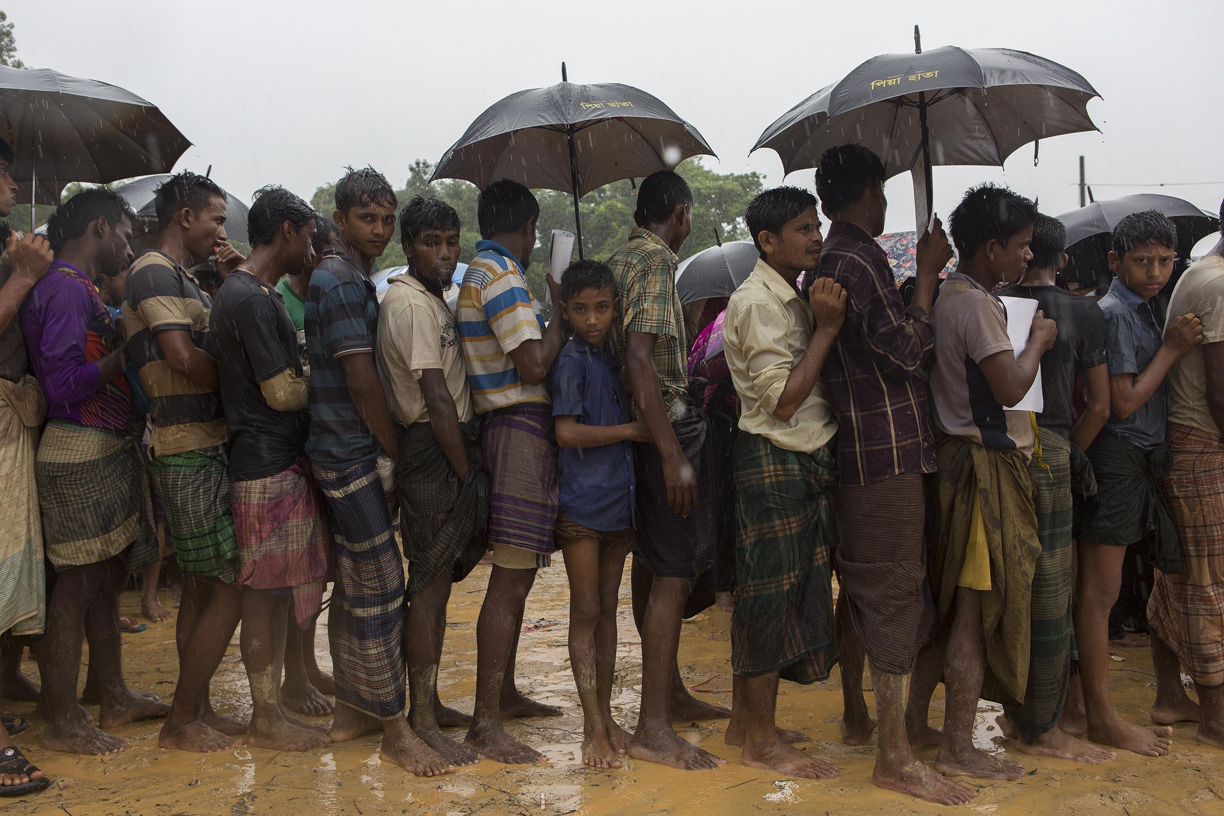 NGO 단체가 보급하는 생필품을 받기 위해 난민들이 줄을 섰다. 1980년대 초 미얀마 군부 정권의 탄압을 피해 방글라데시로 건너온 수천명의 로힝야 난민들이 정착해있다. 2018년 7월 쿠투팔롱캠프, 방글라데시