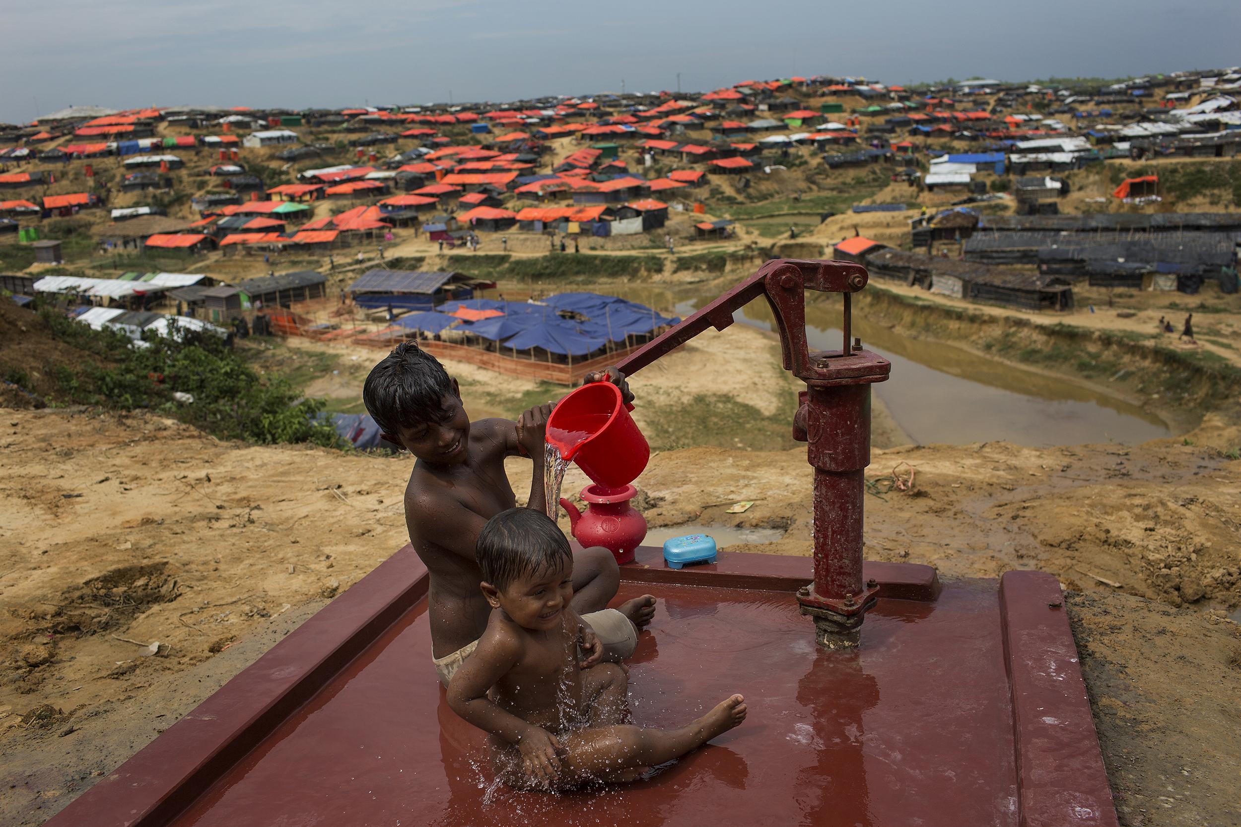 난민들의 생존을 위해 지속적인 물 공급은 필수이다. 대부분 지하수 관정을 통해 용수를 공급한다. 풍족한 물은 이 지역에 유일하게 허락된 자연의 선물이다. 2017년 11월 쿠투팔롱캠프, 방글라데시